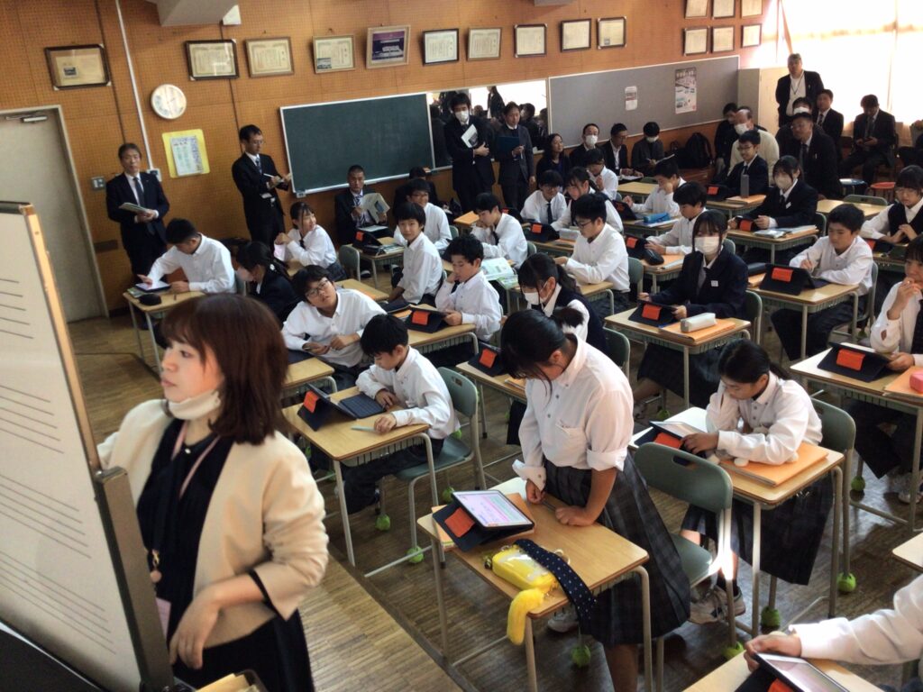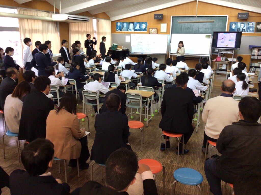 11月27日(木)別府市教育実践研究事業「公開授業研究発表会」を実施しました。寺岡教育長をはじめ、別府市教育委員会の皆様、市内の小中学校の先生方にもご参加いただき、本校の提案授業及び事後研究会が行われました。本校では「事実解釈型」の授業研究を進めており、授業中の生徒のつぶやきや思考の揺らぎ、友だちとの対話の流れといった“事実”を職員間で共有しながら、授業改善の方向性を探求しています。