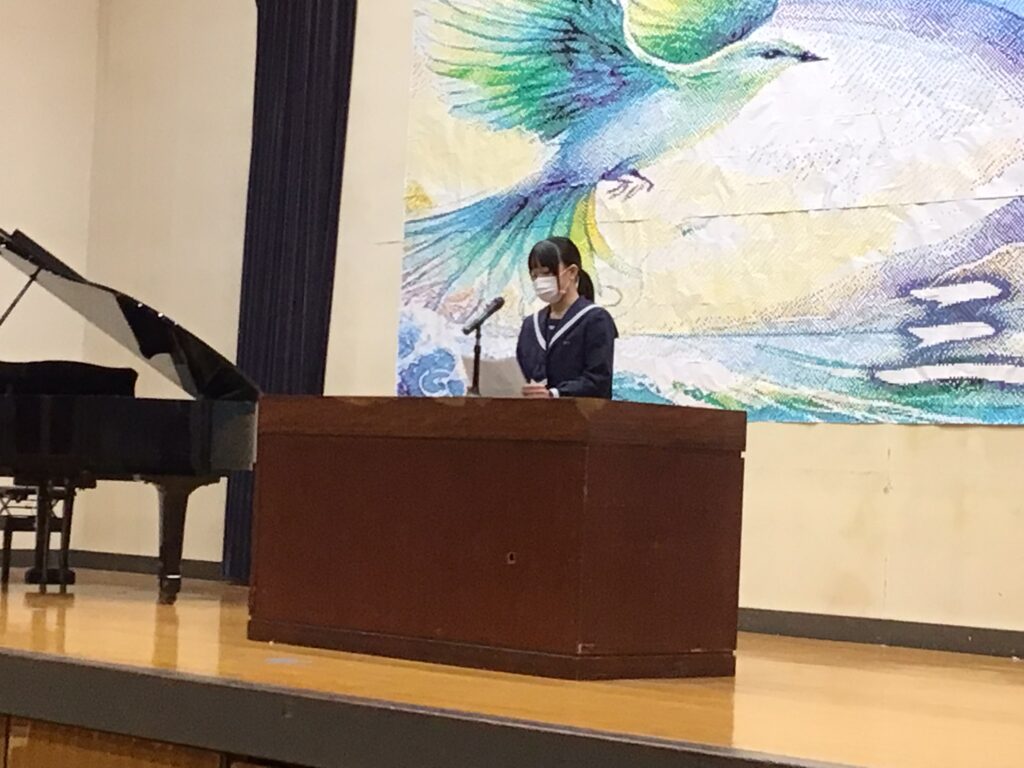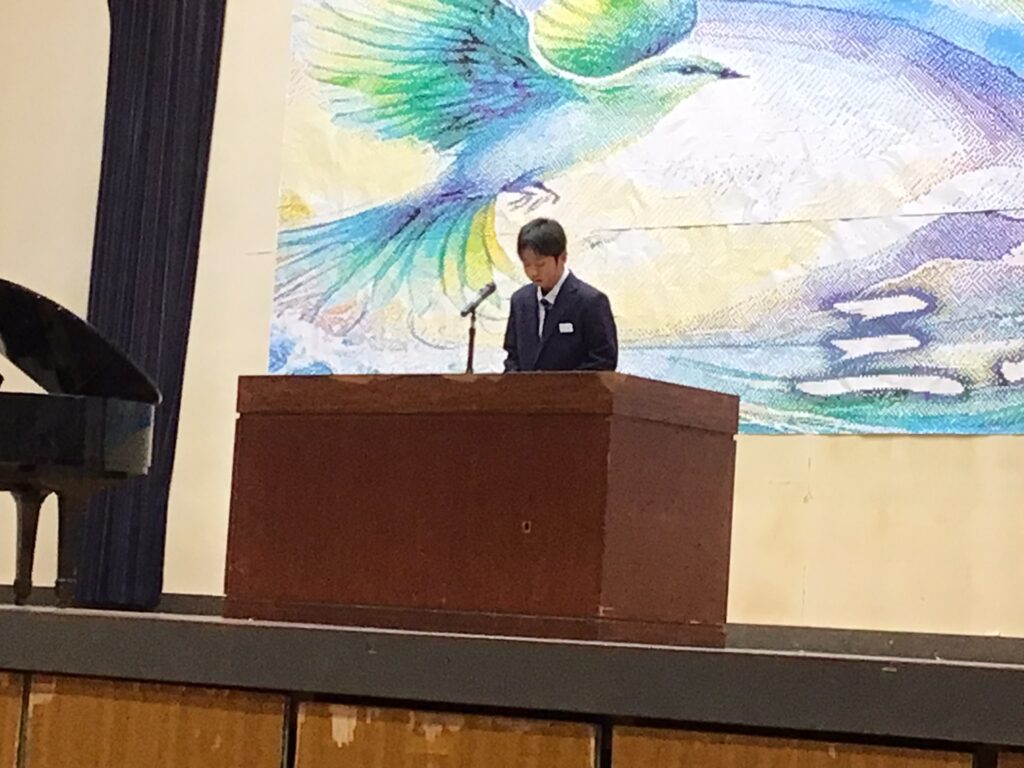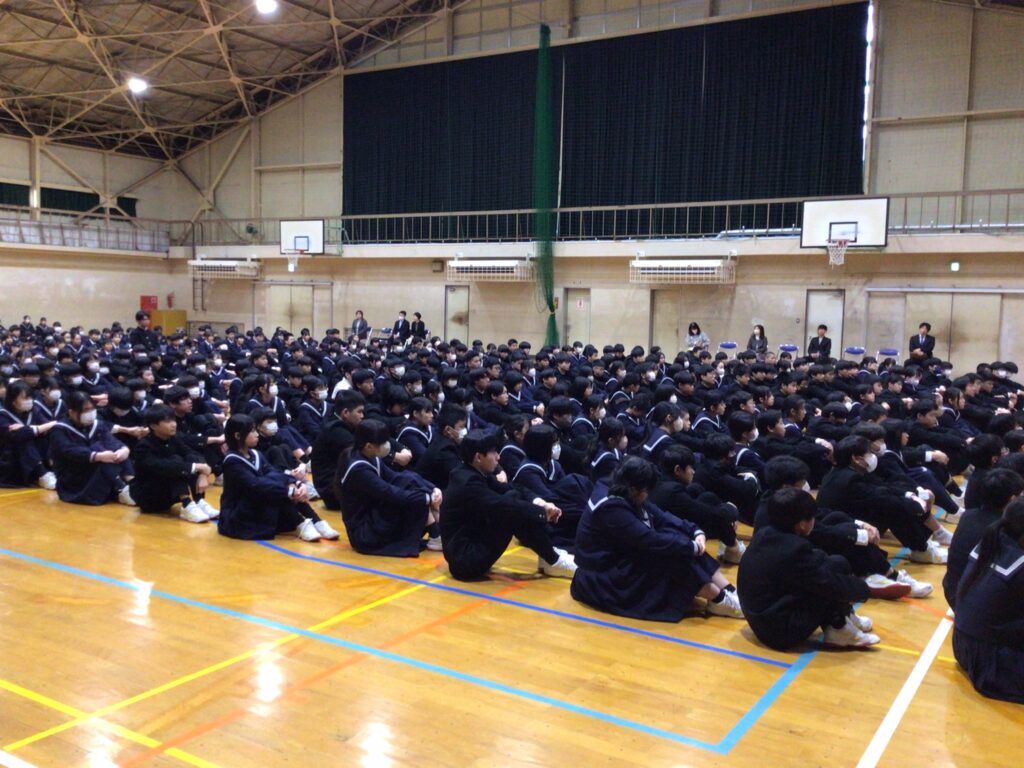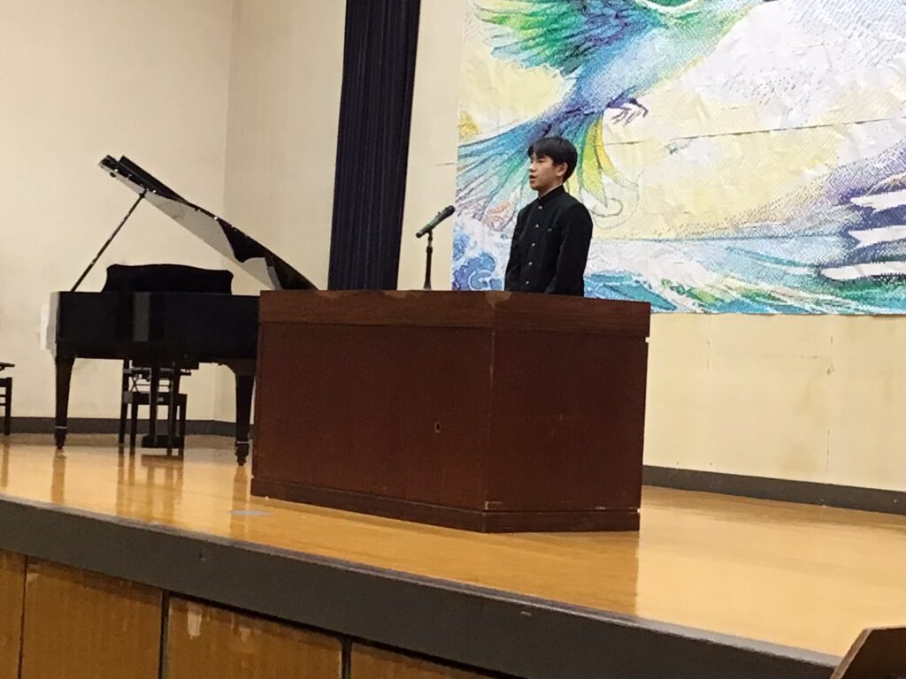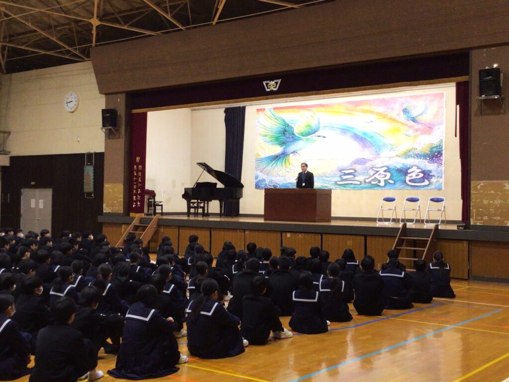 1月8日(水)1年間の総まとめの学期「3学期始業式」を行いました。校長式辞では「約2週間の冬休みはどうでしたか。10年ぶりのインフルエンザ大流行で苦しんだ年越しだった人もいたでしょう。夕べは健康な1年が送れるよう七草がゆを家でふるまってもらいました。皆さんも心も体も健康な1年であることを願っています。また、新たな気持ちで目標を定め、チャレンジしてほしい。そして次年度につながる学期になるよう一緒に頑張りましょう」と式辞を述べました。生徒の意見発表では、1年生:永弘樹さん、2年生:岡田ひかりさん、3年生:松村礼さんがこれまでの振り返りと新学期の抱負を語ってくれました。3年生の松村さんは、「将来は大好きな別府の地でハンバーガーの店を出したい。健康的なハンバーガーにするので、是非食べに来てほしい。残された中学校生活でさらに絆が深まる学年にします」と力強く夢と決意を語ってくれました。頼もしいですね。さぁ、まとめの学期が始まります。今学期も生徒一人一人、先生も一緒に輝ける学期(年)にしていきましょう。