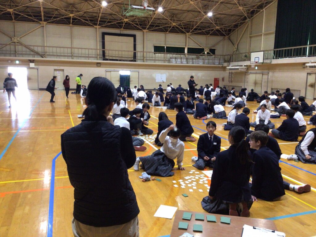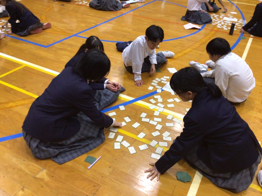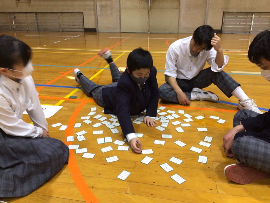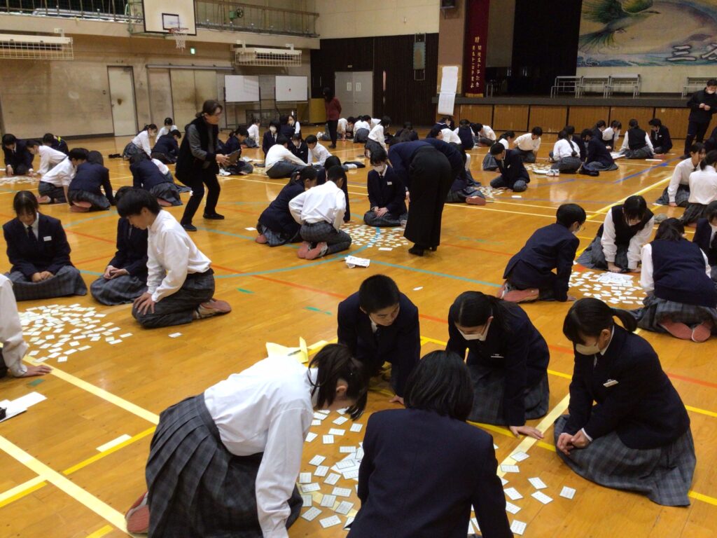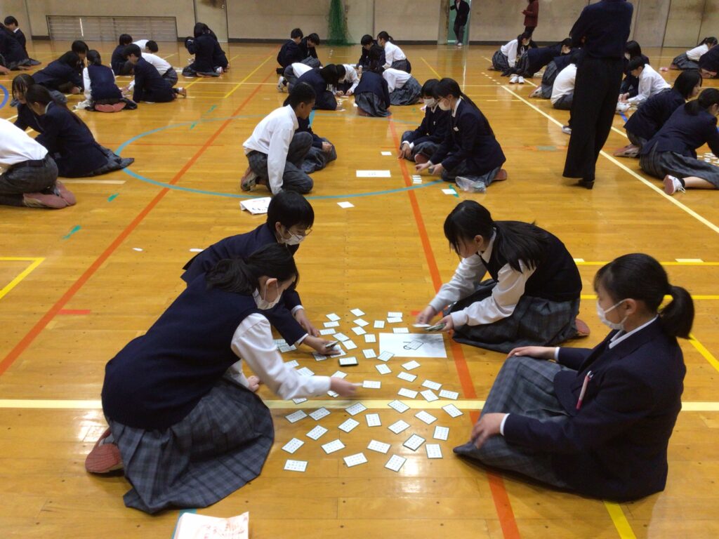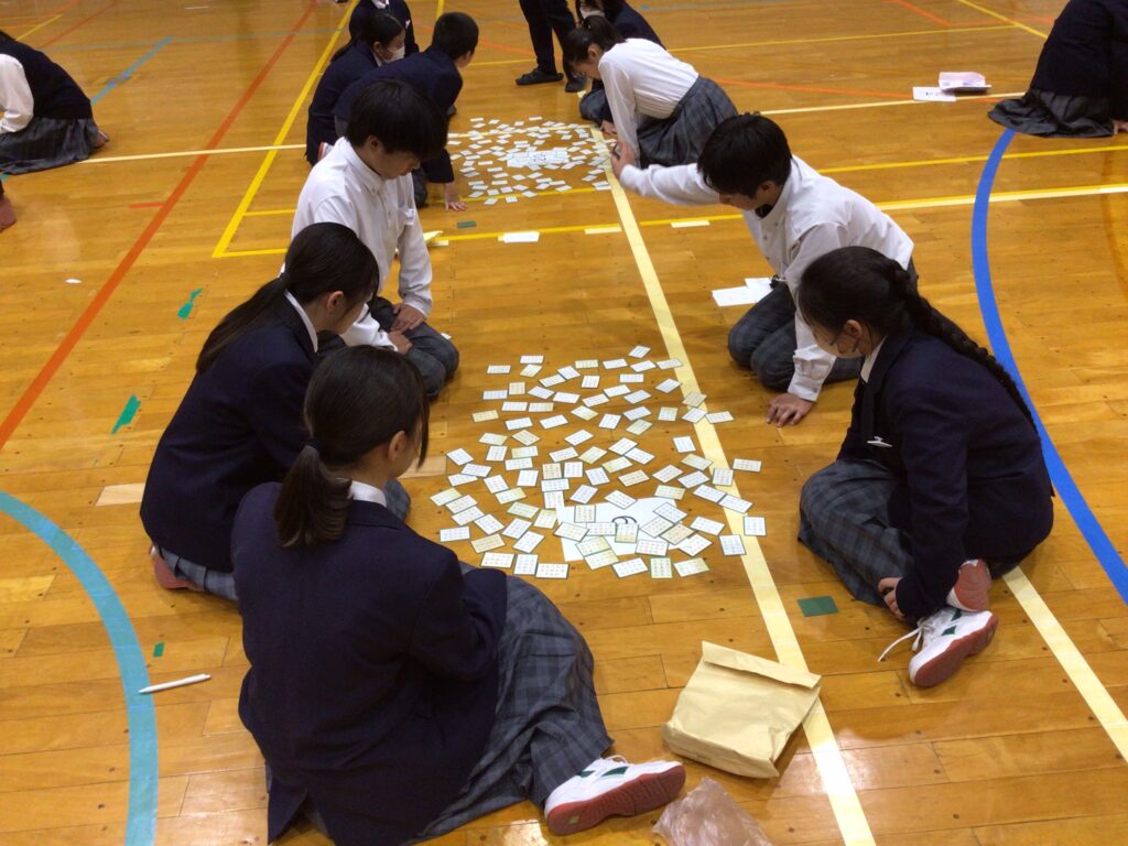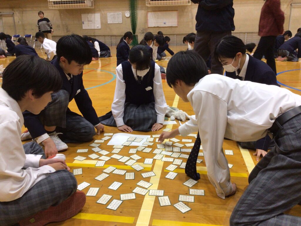 1月23日(木)5:6限、1年生が「百人一首大会」を行いました。百人一首は古典の学習であり、日本の伝統的な文化に触れさせるというねらいがあります。行事の告知は年末からですが、国語の授業や学活を含め、約5時間準備してきました。実行委員長の村田さんが「日本の歴史と文化に触れながら、みんなで楽しく競技してください」と挨拶し、5クラスから一人ずつが1グループとなり、計28グループに分かれスタートしました。 競技方式は①学級対抗戦、②個人戦に分かれています。読み手が(1年部の先生が順番に担います。実は校長も飛入り参加)読み始めるや否や、普段の授業ではなかなか見せない「前のめり(当たり前ですが)」のやる気モード全開の姿が見てておかしくなります。生徒から「先生!声小さいですよー!」の声が出てくることからも、生徒たちの真剣な様子が分かりますね。上の句でとれる生徒、すごいですね。お手つきもあり、転げるように札をとったり、同時に手が重なりジャンケンする場面あり、笑顔がはじけた時間になりました。この勢いで他の教科も主体的な学びにつながっていくことを願っています。お疲れ様でした。…ちなみに2年生は1月31日(金)に実施予定です。