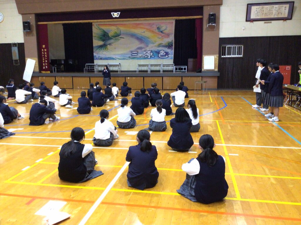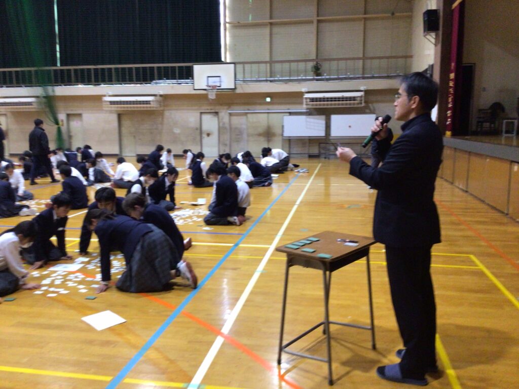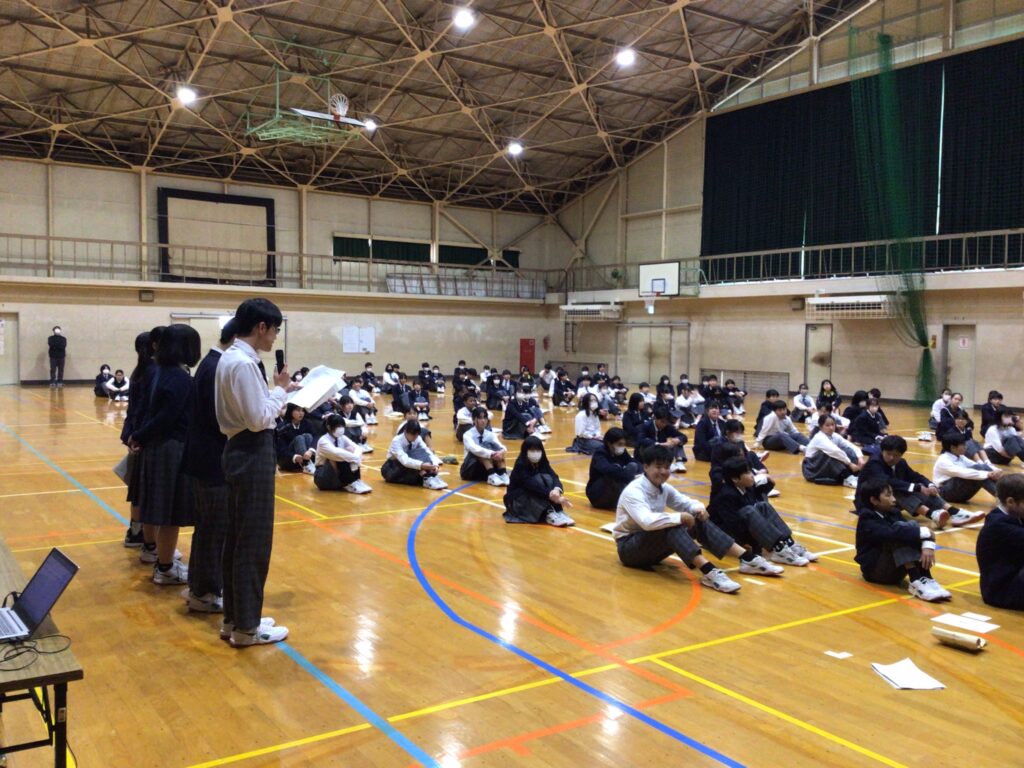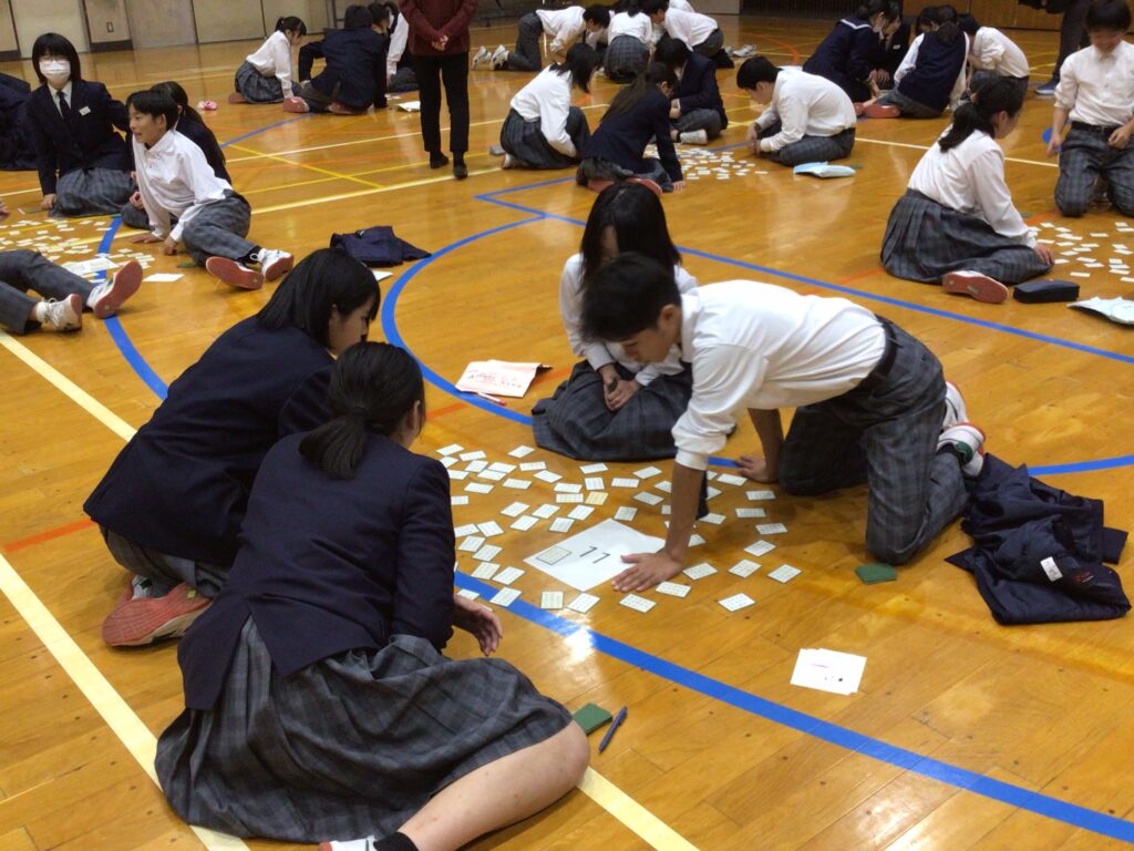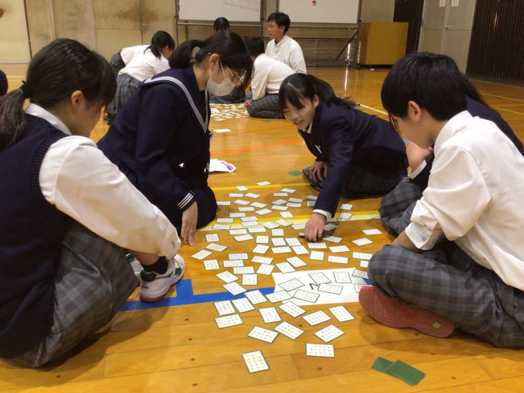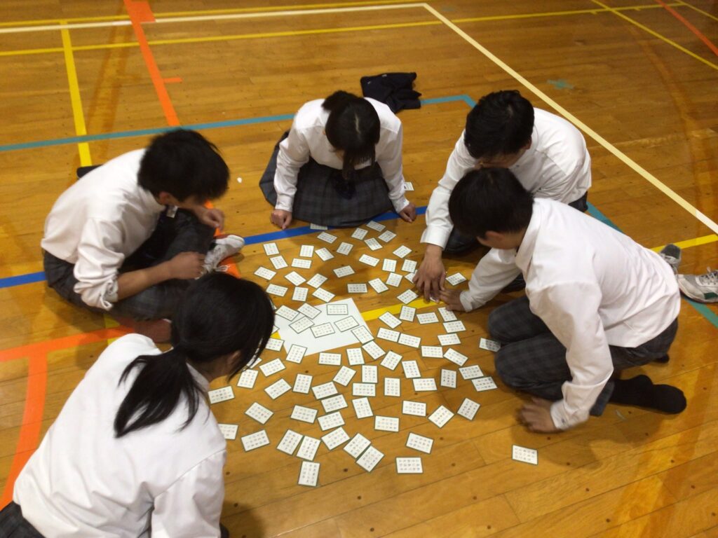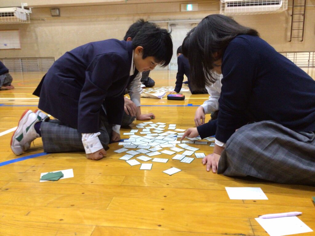 1月23日(木)5:6限、1年生が「百人一首大会」を行いました。百人一首は古典の学習であり、日本の伝統的な文化に触れさせるというねらいがあります。行事の告知は年末からですが、国語の授業や学活を含め、約5時間準備してきました。実行委員長の村田さんが「日本の歴史と文化に触れながら、みんなで楽しく競技してください」と挨拶し、5クラスから一人ずつが1グループとなり、計28グループに分かれスタートしました。 競技方式は①学級対抗戦、②個人戦に分かれています。読み手が(1年部の先生が順番に担います。実は校長も飛入り参加)読み始めるや否や、普段の授業ではなかなか見せない「前のめり(当たり前ですが)」のやる気モード全開の姿が見てておかしくなります。生徒から「先生!声小さいですよー!」の声が出てくることからも、生徒たちの真剣な様子が分かりますね。上の句でとれる生徒、すごいですね。お手つきもあり、転げるように札をとったり、同時に手が重なりジャンケンする場面あり、笑顔がはじけた時間になりました。この勢いで他の教科も主体的な学びにつながっていくことを願っています。お疲れ様でした。…ちなみに2年生は1月31日(金)に実施予定です。