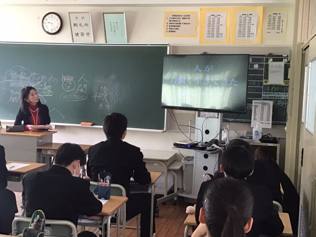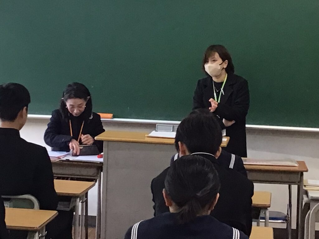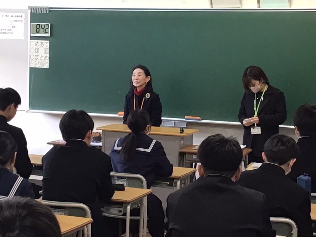 福祉の捉え方として「ウェルフェア(welfare)快い・満足な状態」を自分からつくることが必要、この頃では「ウェルビーイング(well being)個人や社会のよい状態」が使われることが多いですが、いずれにしても自分はもちろん、人の人世に寄り添うことがどんなに尊く、素敵なことか、それが福祉でもあることを学ぶことができました。小雪が舞う中、生徒のためにお越しいただき、温かい授業にほっこりさせていただきました。ありがとうございました。