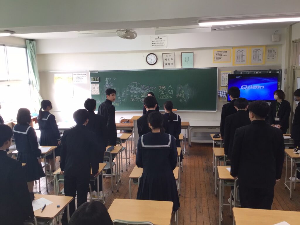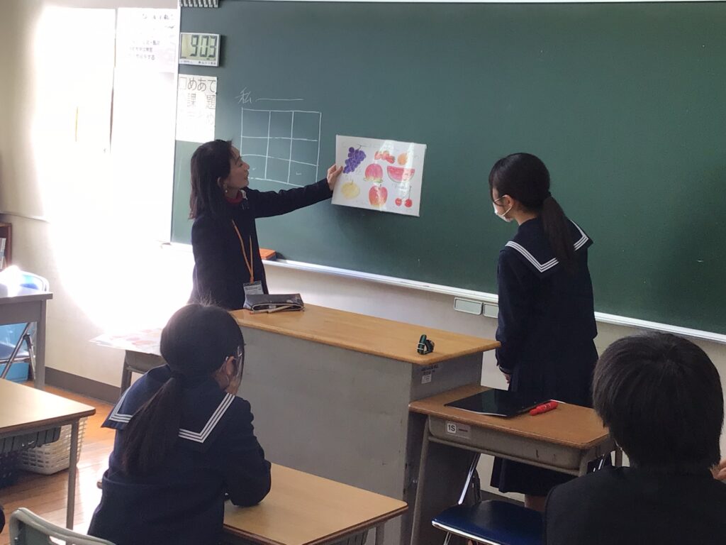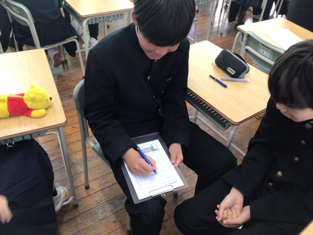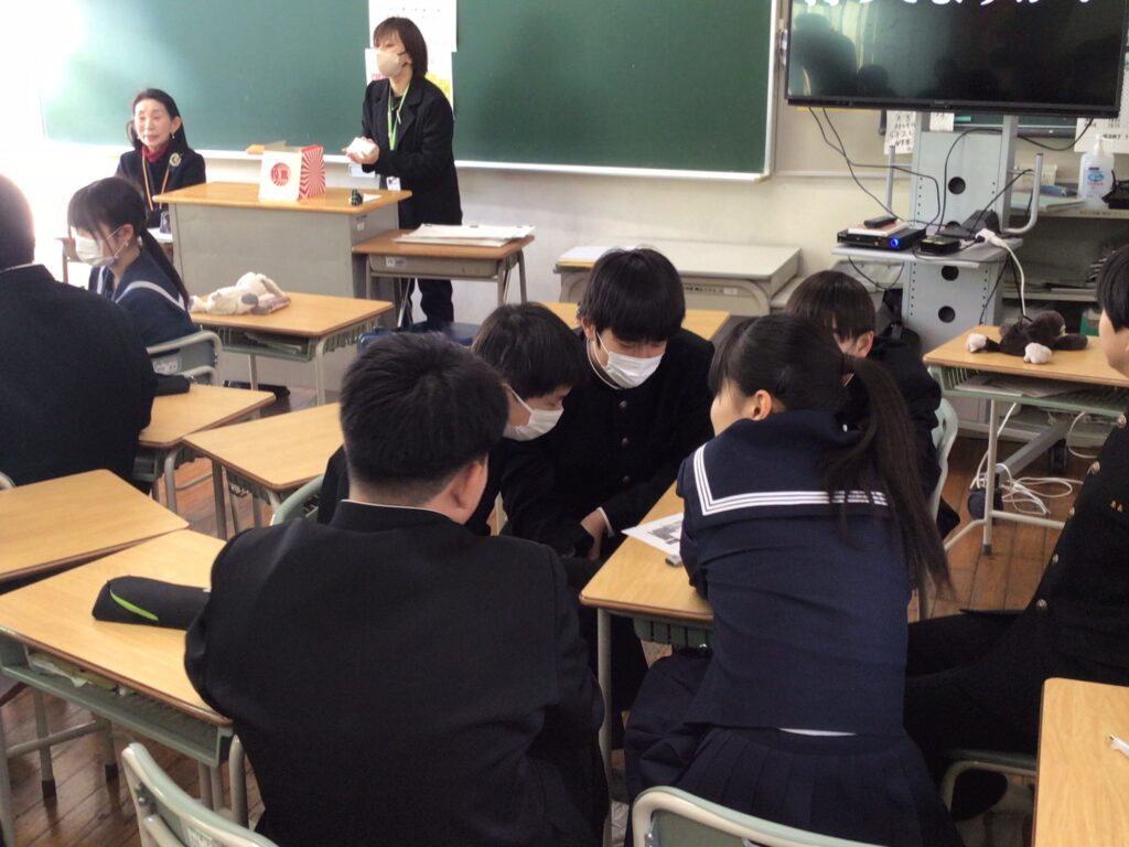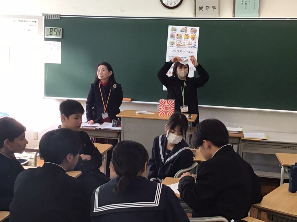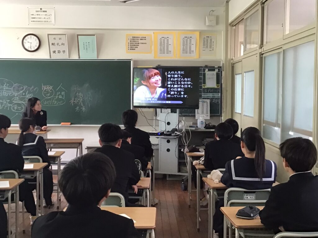 2月5日(水)、別府溝部学園短期大学 介護福祉学科より「溝部佳子学科長、棹友美先生」をお招きし、2年生の各教室で「福祉・介護」の訪問授業を行ってもらいました。「福祉ってなあに?」印象も含めた問いに、生徒からは「あたたかい、優しい、困っている人を助ける」など、ステキな回答が続きます。人の感情は姿勢や態度に現れるもの。マイナスの感情から回復するためにはメンタルケアも大切。その後、簡単なビンゴゲームや生徒の心を読んで当てるゲーム(対決)などでアイスブレイキングが行われ、リラックスした心と体で授業が進められました。
