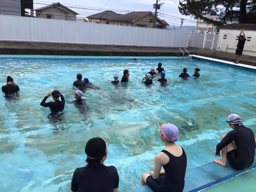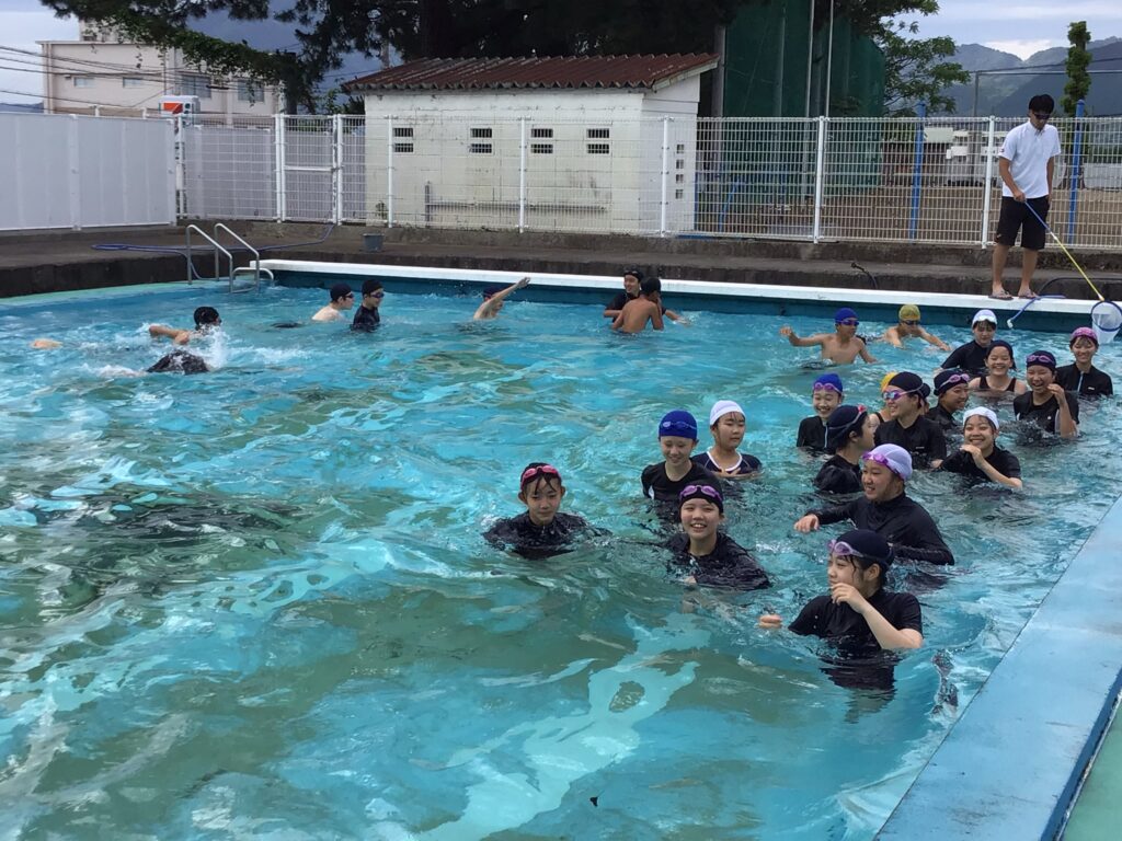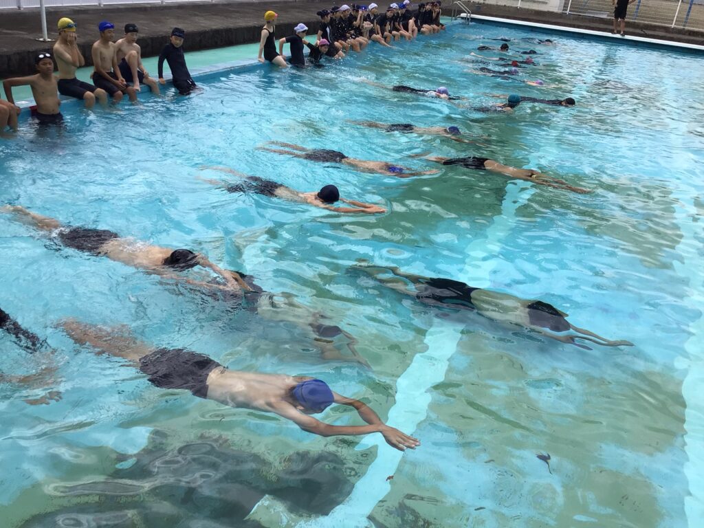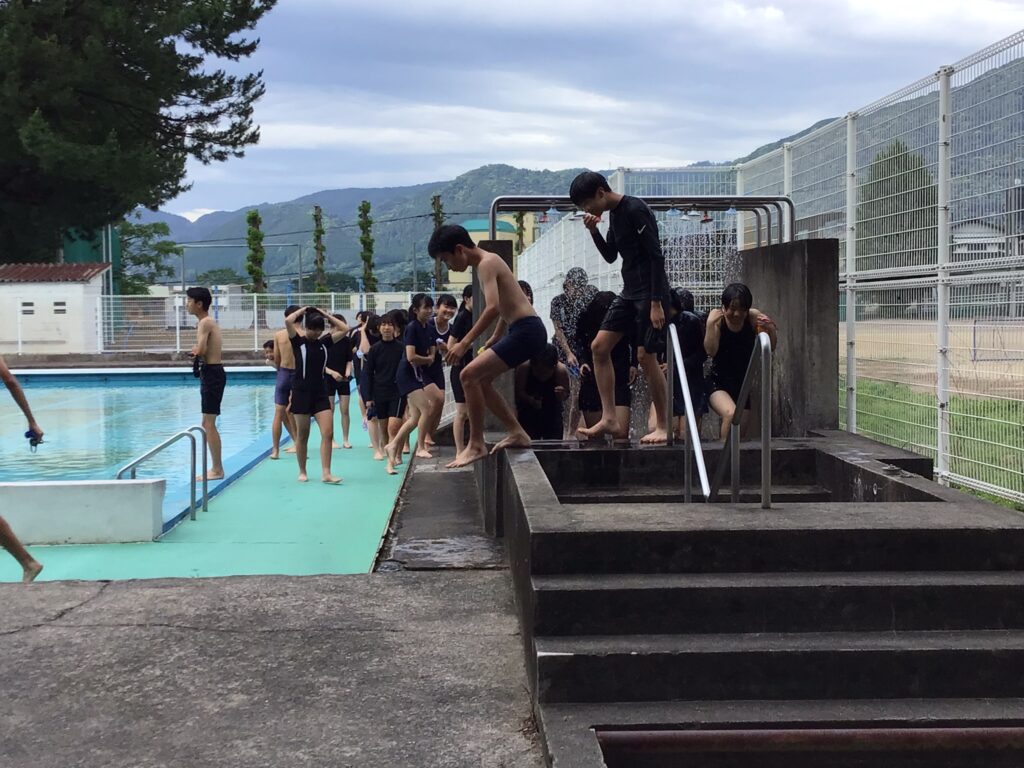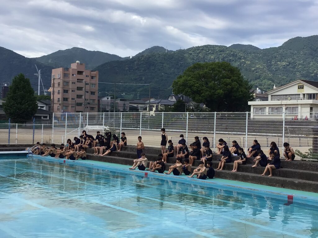 6月18日(水)梅雨の晴れ間の中、プール開きが行われました。今日は、全国的に真夏日を観測するところが多く、プール開きには絶好の日となりました。事故防止に向けた「バディ・システム(互いの安全を守る)」を学び、入水前に早速二人組でバディを確かめ合っていました。最初は水慣れから始まり、け伸びからのストリームライン。一年ぶりの水泳に喜びがはじけていましたね。終業式までの約1か月ですが、安全・安心な授業に努め、より早く泳ぐ、長く泳ぐコツがつかめるとよいですね。