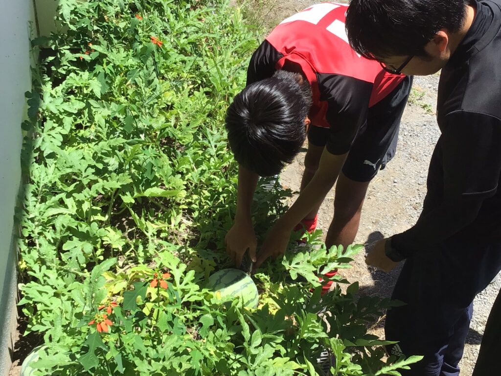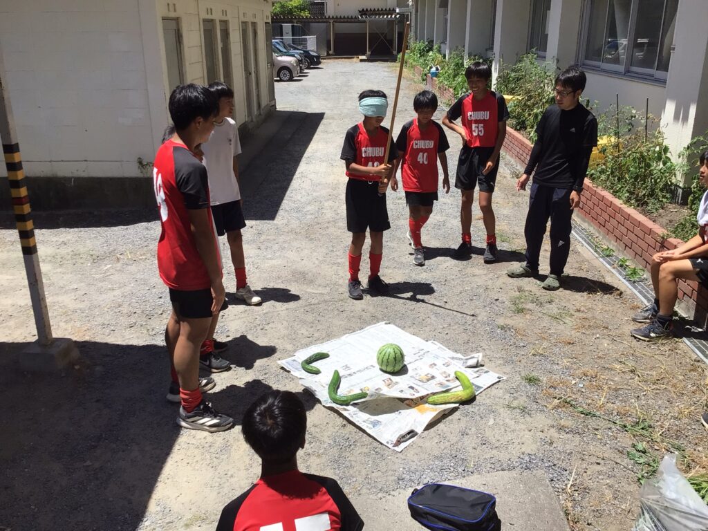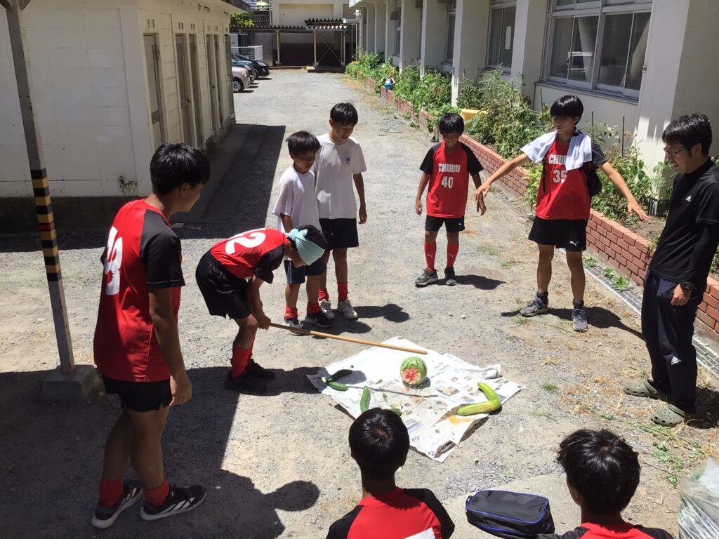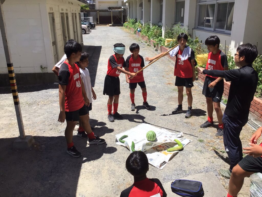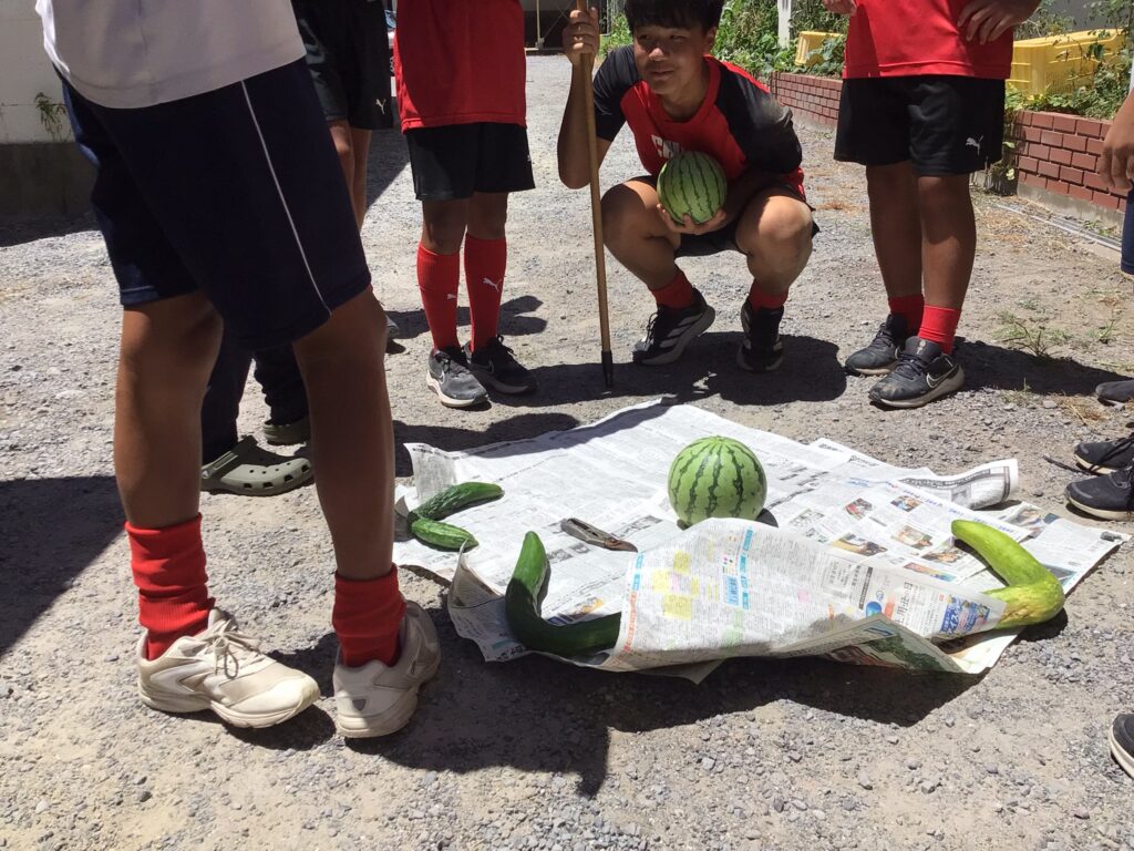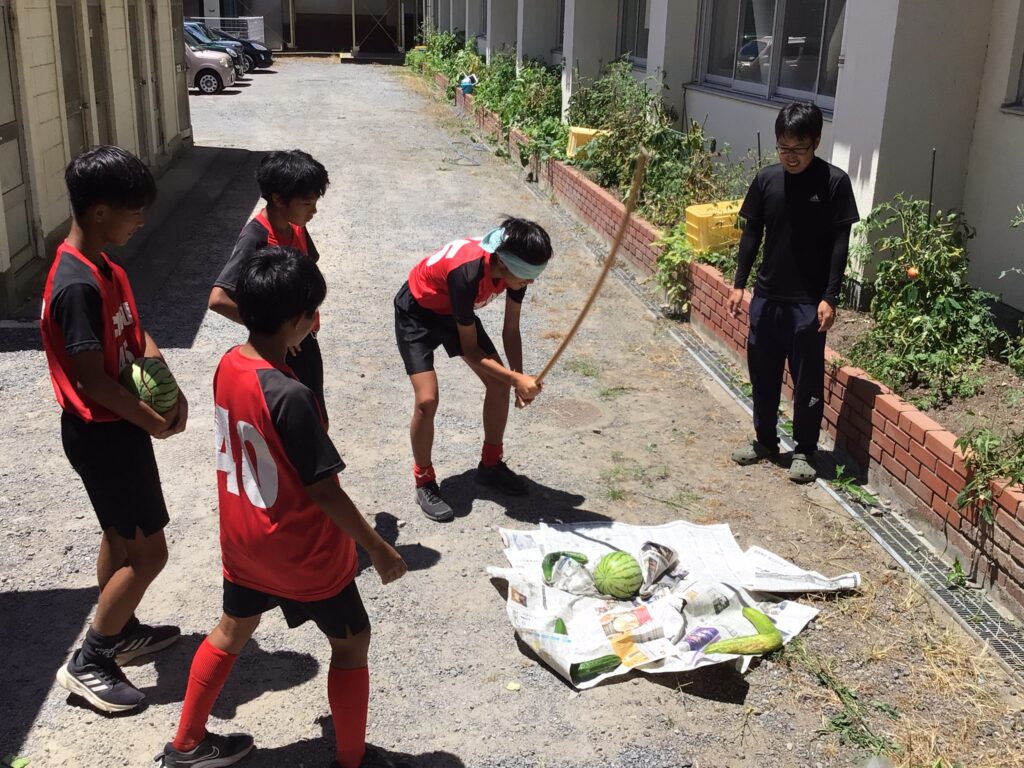7月31日(木)正午過ぎ、酷暑の中、練習を終えたサッカー部の生徒たちに応援依頼し、収穫祭?をやってみました。5月に植え付けた様々な野菜たちも夏休み中のお世話はもっぱら先生たちのお仕事になってしまいます。今日は食べごろのスイカを収穫し、生徒にスイカ割まで体験してもらいました。海岸の砂浜で行うのが定番ですが、定番には定番の理由があるのですね。固い地面を打つと棒が折れる…。若干、ヒヤリハットを起こすところでしたが、みんな怪我無く、楽しめたのではと思います。技術科の藤沖先生は、事前に冷やしたスイカも準備してくれていたので、それぞれをおいしくいただくことができました。