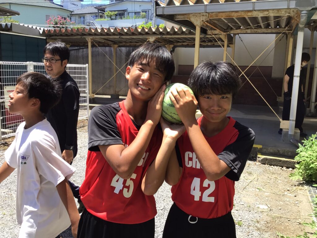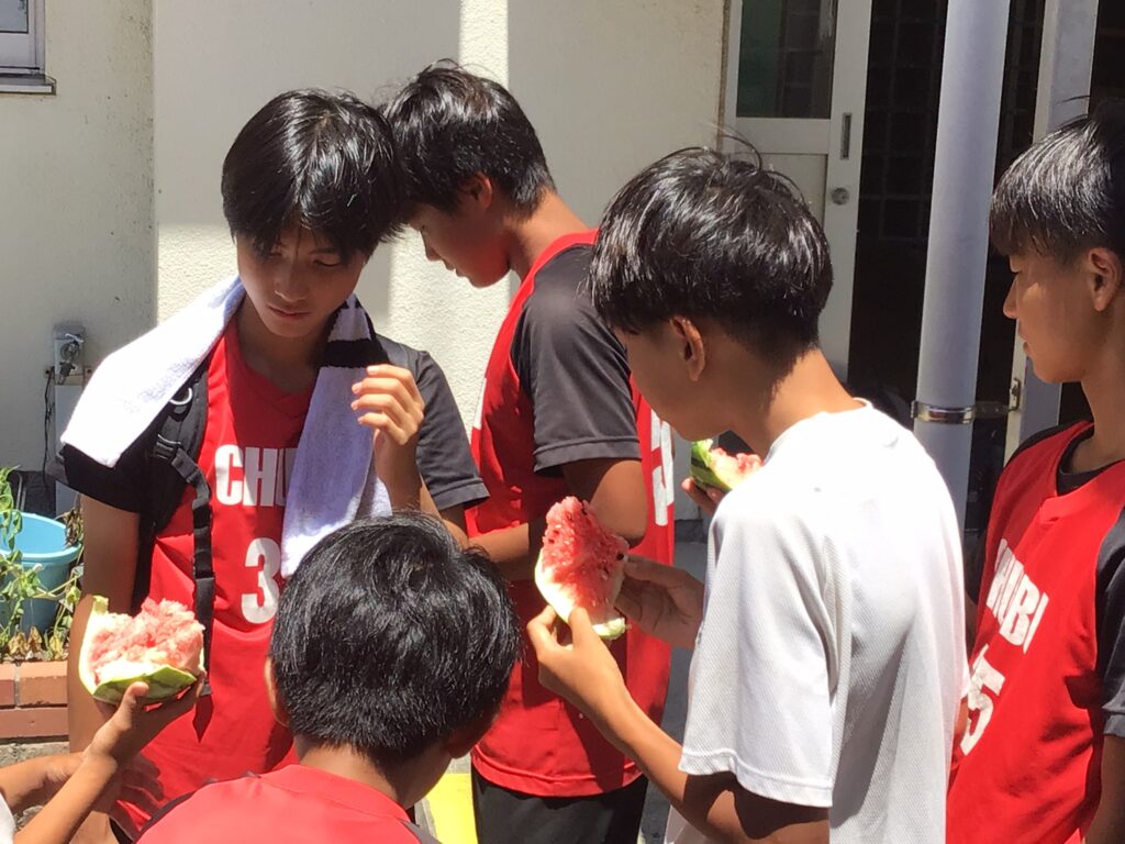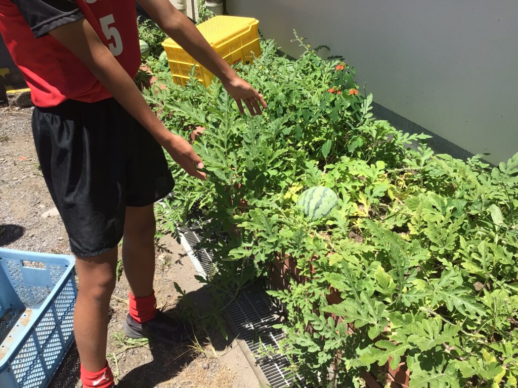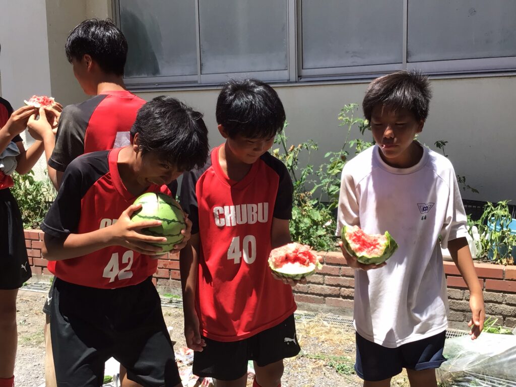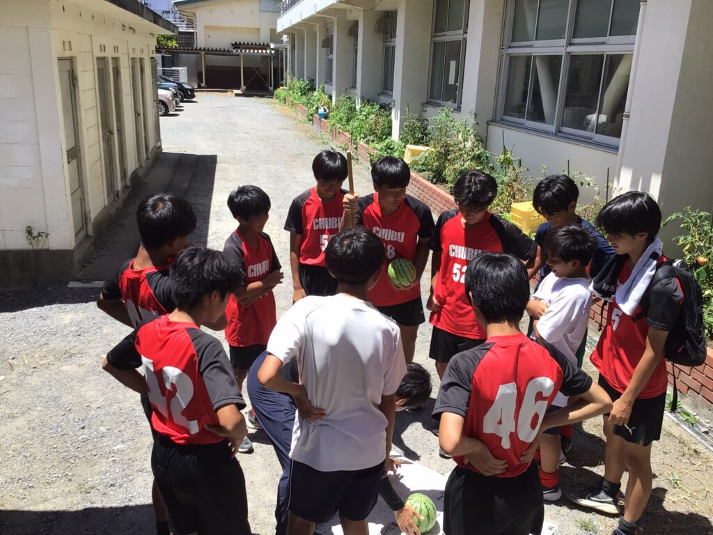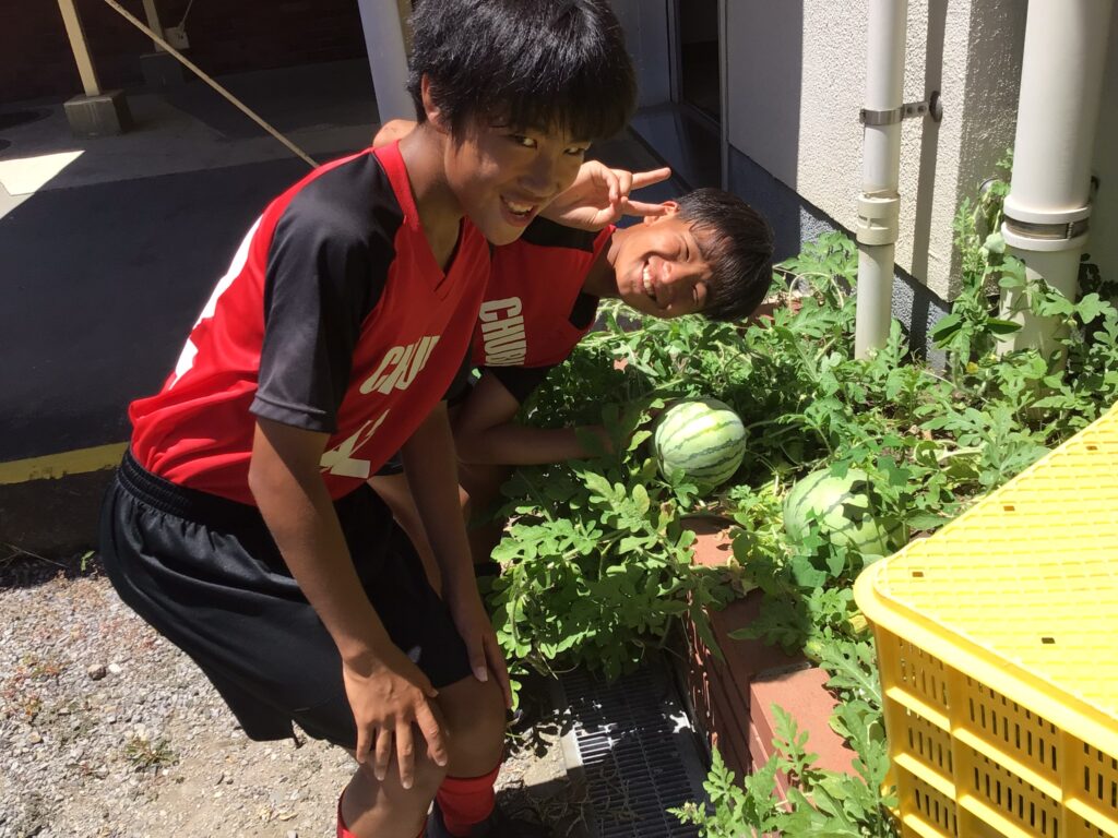 7月31日(木)正午過ぎ、酷暑の中、練習を終えたサッカー部の生徒たちに応援依頼し、収穫祭?をやってみました。5月に植え付けた様々な野菜たちも夏休み中のお世話はもっぱら先生たちのお仕事になってしまいます。今日は食べごろのスイカを収穫し、生徒にスイカ割まで体験してもらいました。海岸の砂浜で行うのが定番ですが、定番には定番の理由があるのですね。固い地面を打つと棒が折れる…。若干、ヒヤリハットを起こすところでしたが、みんな怪我無く、楽しめたのではと思います。技術科の藤沖先生は、事前に冷やしたスイカも準備してくれていたので、それぞれをおいしくいただくことができました。