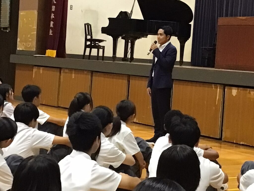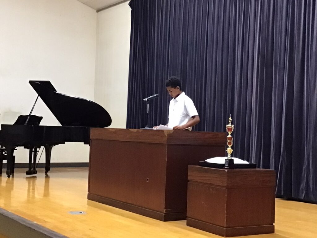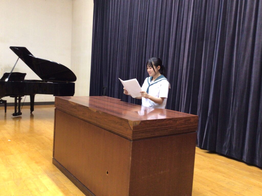 校長式辞では、2学期はたくさんの行事があり、全力で取組む中で、クラスや学年の絆が一層深められるチャンスであること。また、1学期の終業式で話した「みんなに平等に与えられている『時間』について、より意識しながら無理・無駄のない計画を立てて実りある2学期にしていこう」と話しました。生徒代表の意見発表では、1年生の阿南さん、2年生の二宮さん、3年生の矢野さんが夏休みの振り返りや2学期の抱負について発表してくれました。2年生の二宮さんは、よく校長が話す「応援される人・クラスをめざして頑張りたい」「たくさんの行事でみんなと協力していくことがとても楽しみで友情を大切にしていく」と語ってくれました。