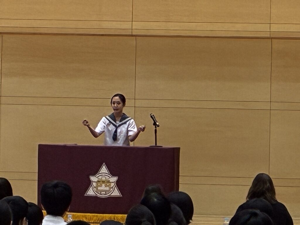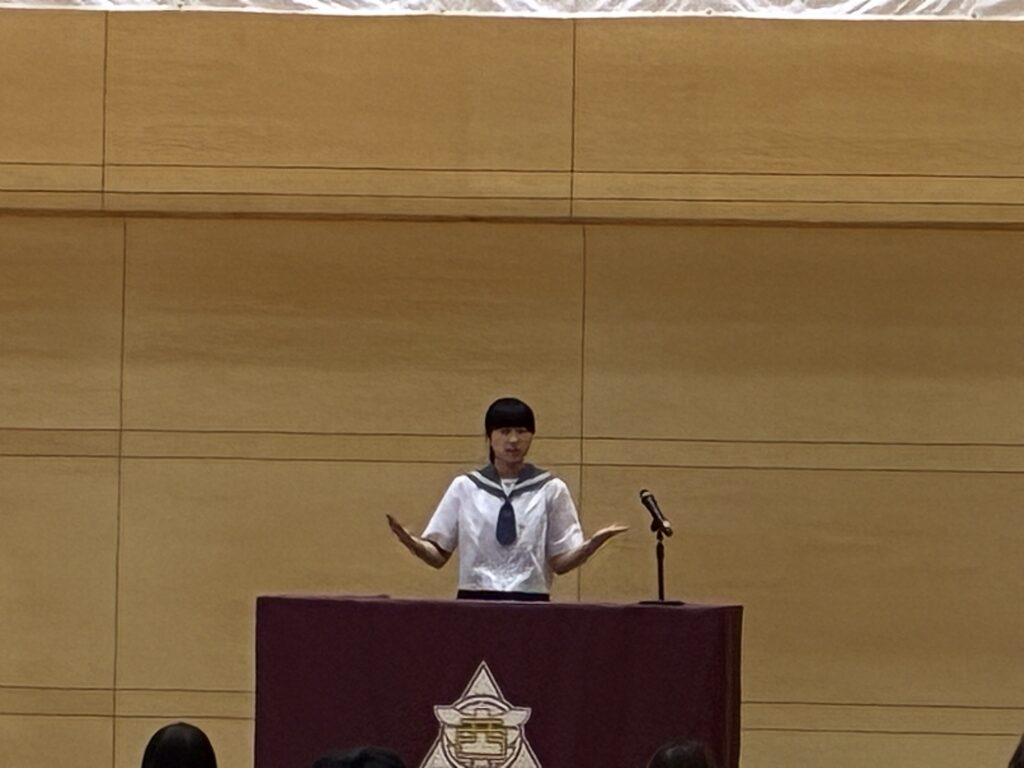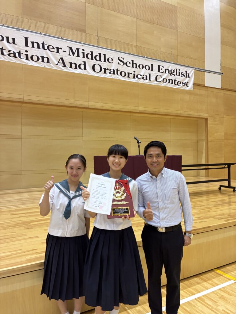 9月5日(金)別府西中学校を会場に、別府市中学校英語弁論・暗唱大会が開催されました。本校から2年生2名(李 世利さん、小手川 陽彩さん)が参加し、「暗唱の部」において、李 世利さんが見事「第1位」を獲得しました。2人は出場が決まった7月から練習を始め、放課後の時間や夏休み中にも学校で練習してきました。英単語の発音はもとよりジェスチャーや表情・表現方法などたくさんの学びを得ることができました。指導していただいた先生方、そしてALTのリック先生には感謝しかありません。今日は大勢の観客やライバルがいる中でしたが、自信に溢れた発表は本当に素敵でした。努力を重ねた成果が形となり、さらに自信を深められたと思います。これからも英語の学びを深め、言葉を通じて世界とつながる力を育んでください。大変お疲れ様でした。