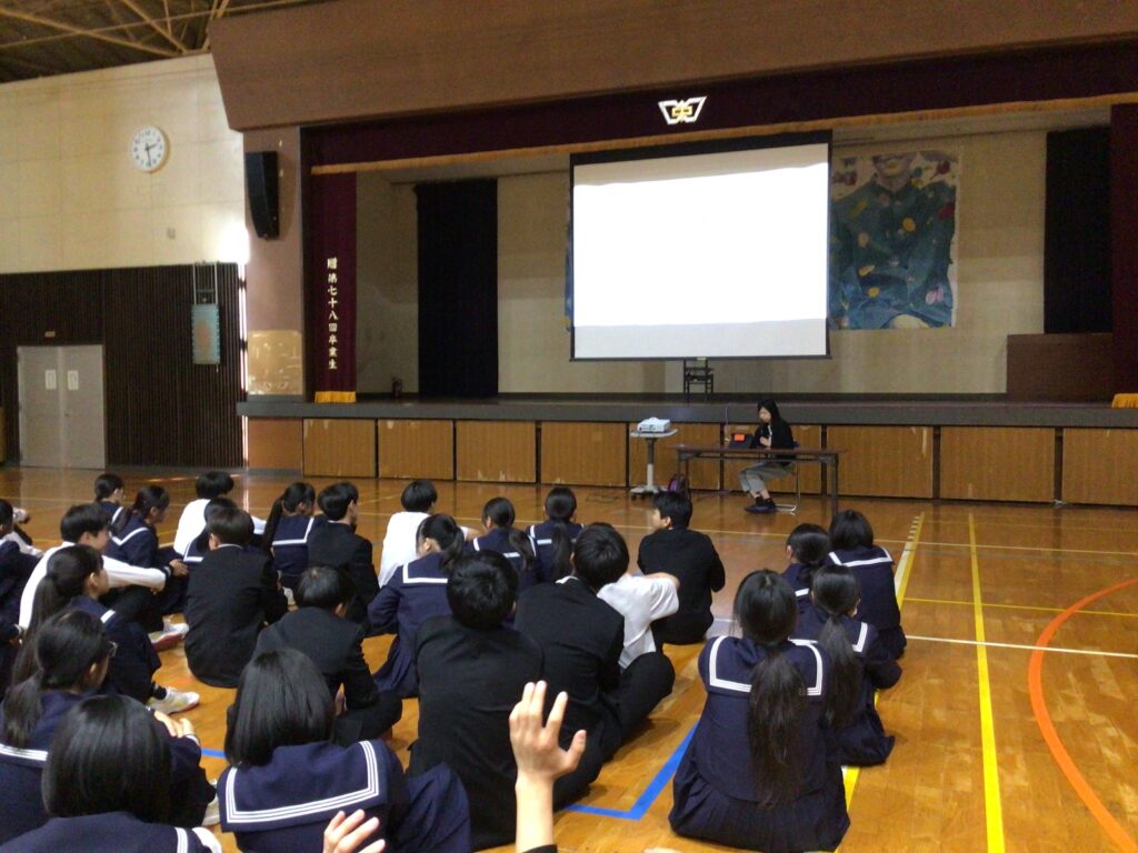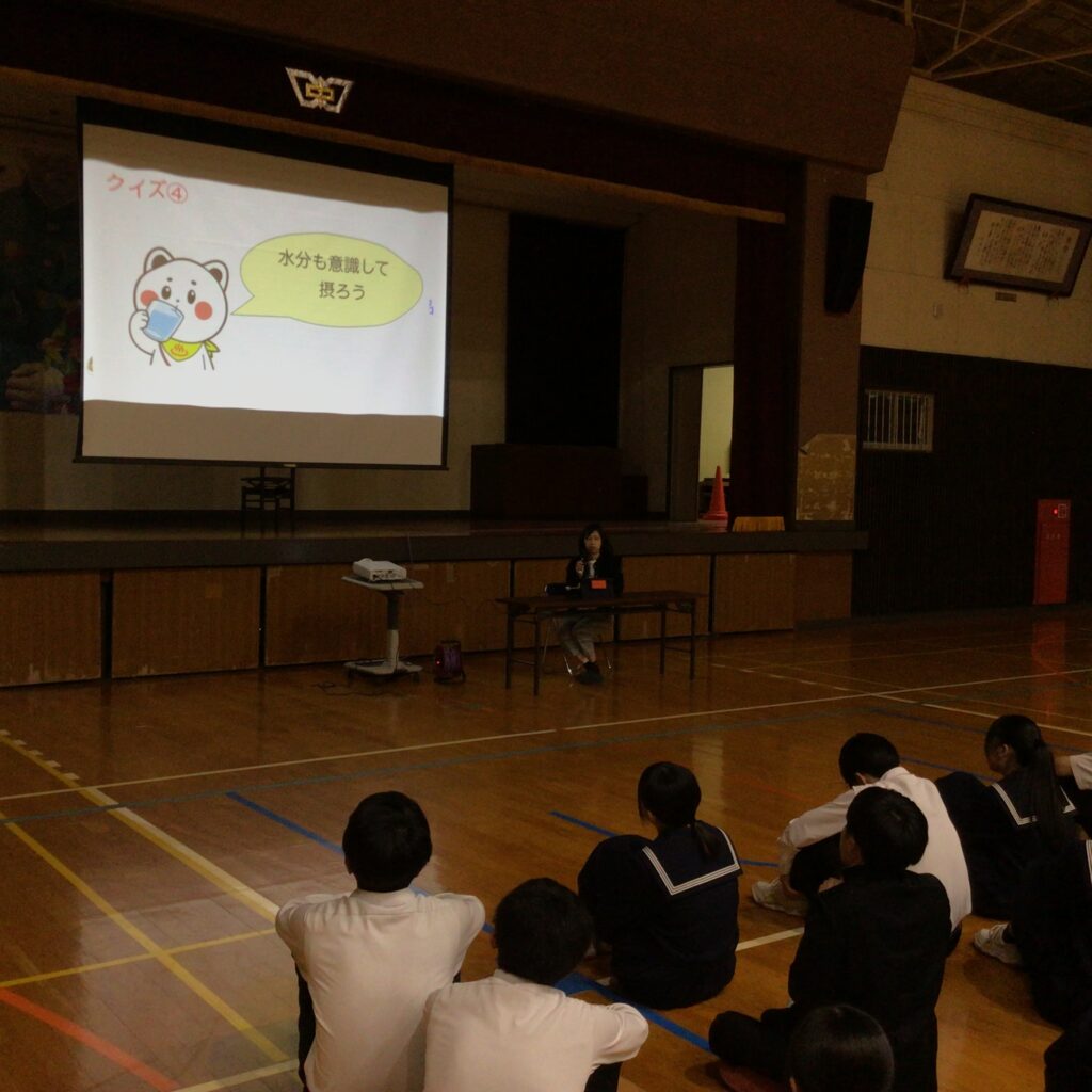 食事や睡眠が心身の健康を支え、日々の学習にも大きく関わっていることについてお話があり、生徒たちは終始、真剣な表情で耳を傾けていました。中でも、「タンタンビタ」という合言葉を通して、炭水化物・たんぱく質・ビタミンが、健やかな身体づくりに欠かせない大切な栄養素であることを分かりやすく学ぶことができました。