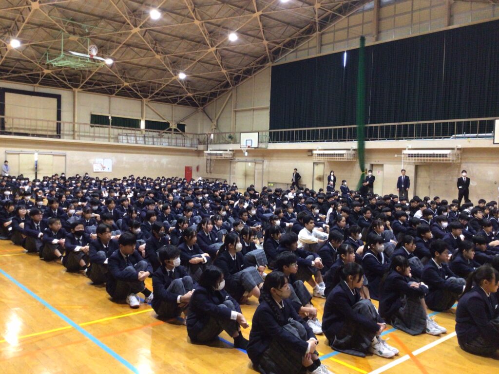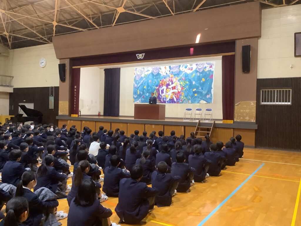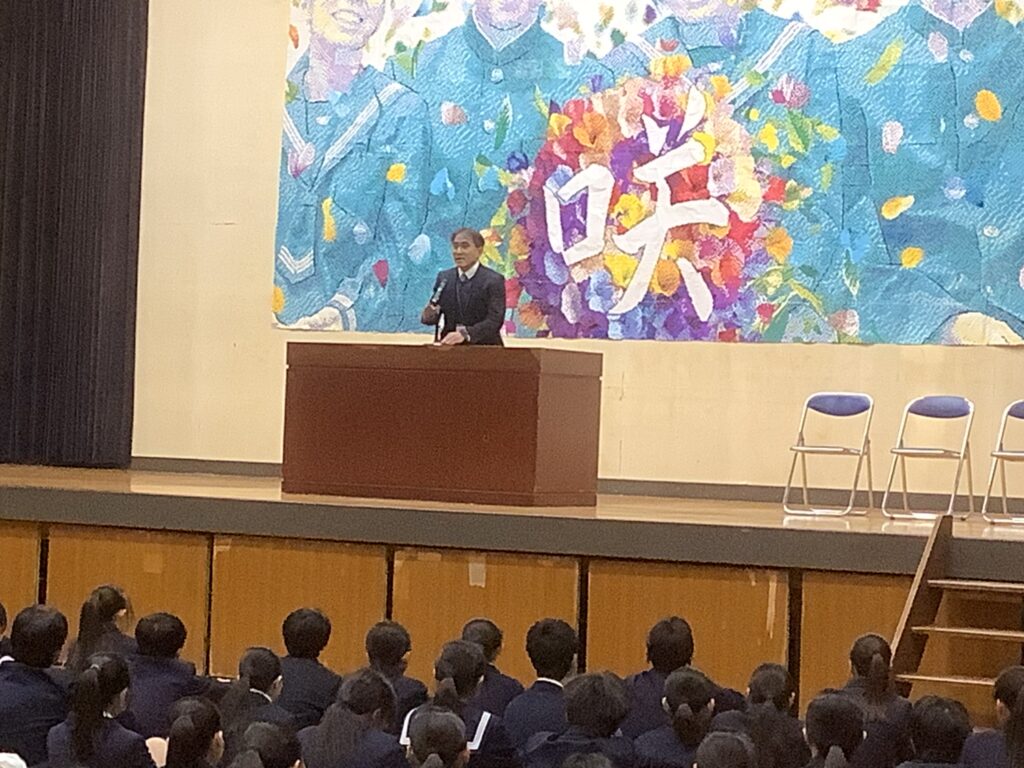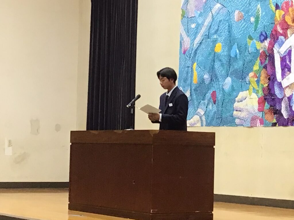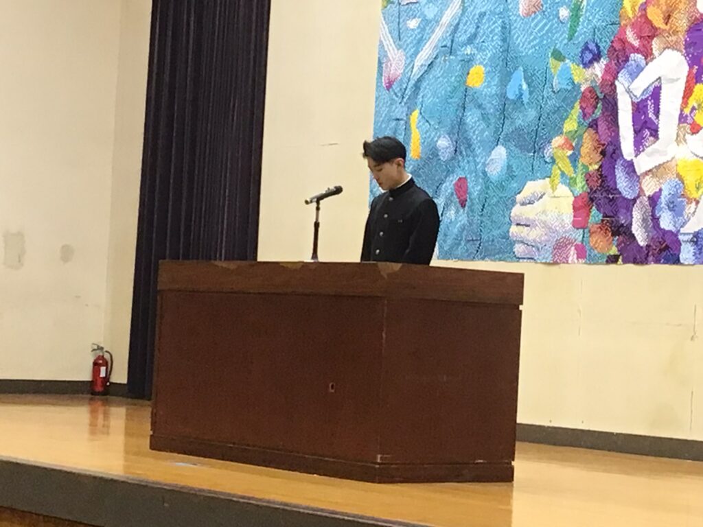 そして生徒の意見発表では、2年生:永弘樹さん、3年生:糸長由介さんが、冬休みをはじめ、これまでを振り返り、3学期は1年間の最後の締めくくりに相応しい学期・クラスにしたいこと。部活動でさらなる高みを目指したいこと。受験に打ち勝ち、学年のみんなで合格して喜び合いたいことなどを力強く語ってくれました。