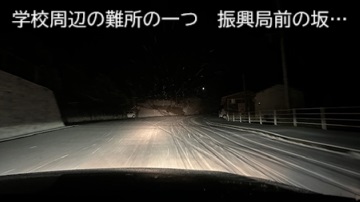 学校に近づくにつれて徐々に積雪量が増加…。特に今回は路面凍結した上に積雪がみられので、スクールバス運行は難しいと判断しました。学校周辺は10㎝の積雪量…。自然はやっぱりすごいです。