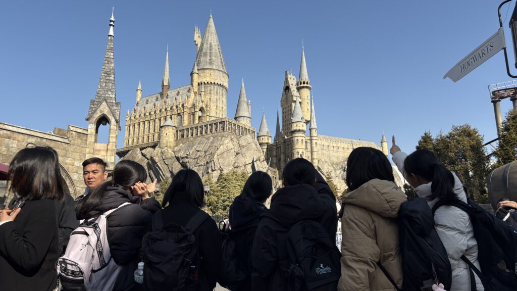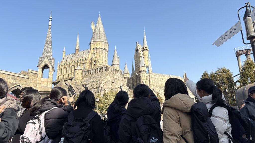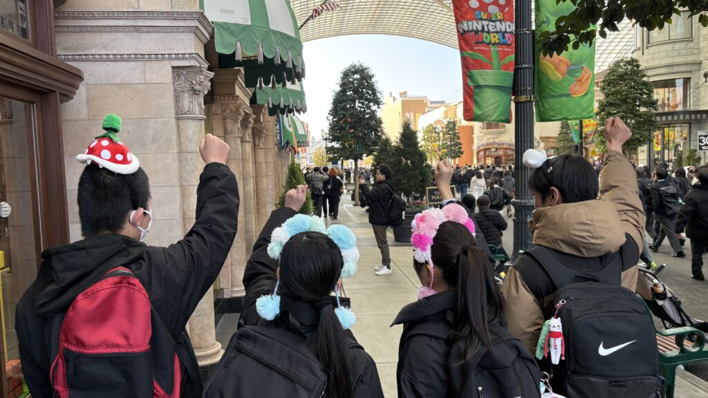 生徒たちが心待ちにしていたユニバーサル・スタジオ・ジャパン(USJ)です。キャラクターグッズを身に着け、最新のアトラクションに心躍らせる生徒たちの表情は、今日一番の輝きを見せています。