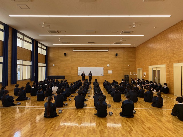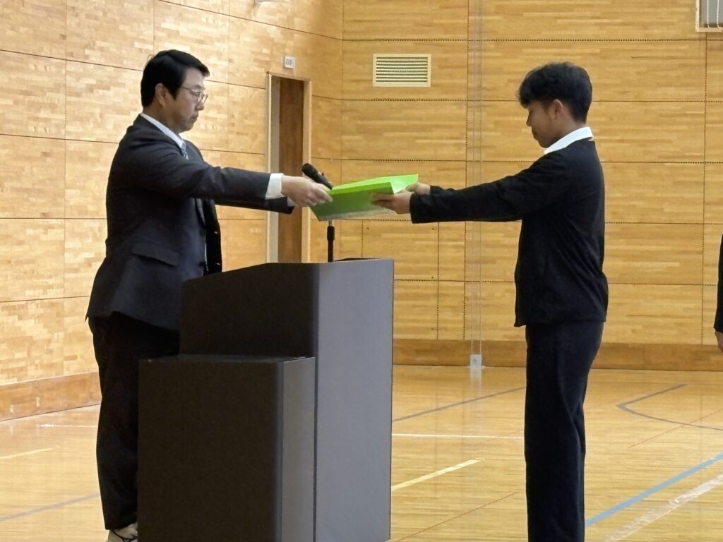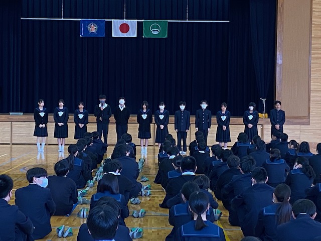 3月26日(木)令和7年度の修了式を挙行しました。式では各クラスの代表生徒に修了証書を授与しこの1年間の努力と成長を讃えました。また、1年の日野心春さん、2年の宮本大輝さん、生徒会代表の工藤綾香さんが、今年度の振り返りと次年度への希望に満ちた抱負を力強く発表しました。その後の学年集会でも、1年前より一回り逞しくなった生徒たちの真剣な姿が見られ、確かな成長を実感する一日となりました。保護者・地域の皆様、1年間本校への温かいご支援を賜り、心より感謝申し上げます。