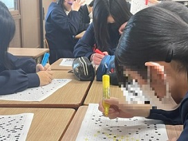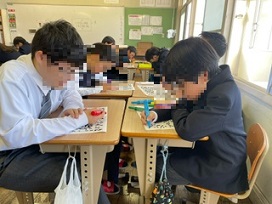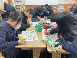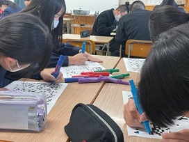 昨日の6限のこと。全校の生徒会主催の取組(*^-^*)毎年、卒業式に併せて体育館に掲げる壁画つくりの第一歩です。全校の生徒一人ひとりがモザイクのマスを塗る作業がありました。一人ひとりが塗り上げるにはもう少し時間がかかりますが、貼り合わせると一枚の絵(写真)になります、さてさて、今年はどんなものに仕上がるのか楽しみです(^-^)vまだまだ、取組は続きます(^_^)/