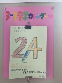 3年生の各教室の一角にあるカレンダー!それは、卒業式までのカウントダウンです(T_T)クラスメイトと過ごす残りの時間を意識したり、卒業後の自分の姿を考えたする良いきっかけにもなります(*^-^*)この冬が終わったら、もう二度と中学生には戻れません。後悔の無いよう、一日一日の学校生活と、今の仲間を大切にして過ごしてほしいと思います(^-^)v