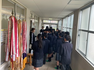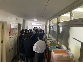 今日は1年生が校舎巡りをしています。この位置に、何の教室があるという場所の確認、職員室の入り方や保健室の利用の仕方、TPO区域の説明などなど担任の先生につれられて話を静かに聞いていました。少しずつ少しずつ慣れて中学生になっていきます(*^-^*)