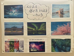 3年生の階段の掲示物。人によって感じ方はそれぞれ。さて、あなたが美しいと感じるのは?大切なのは人によって感じ方が違うということ。自分とは違うから…多くの人と違うから…ではなく、そういう感じ方もあるんだぁーって思える自分がいるかってことではないかと思います。排除ではなく、受け入れること。そのような人が増えると、うれしく思います(*^-^*)