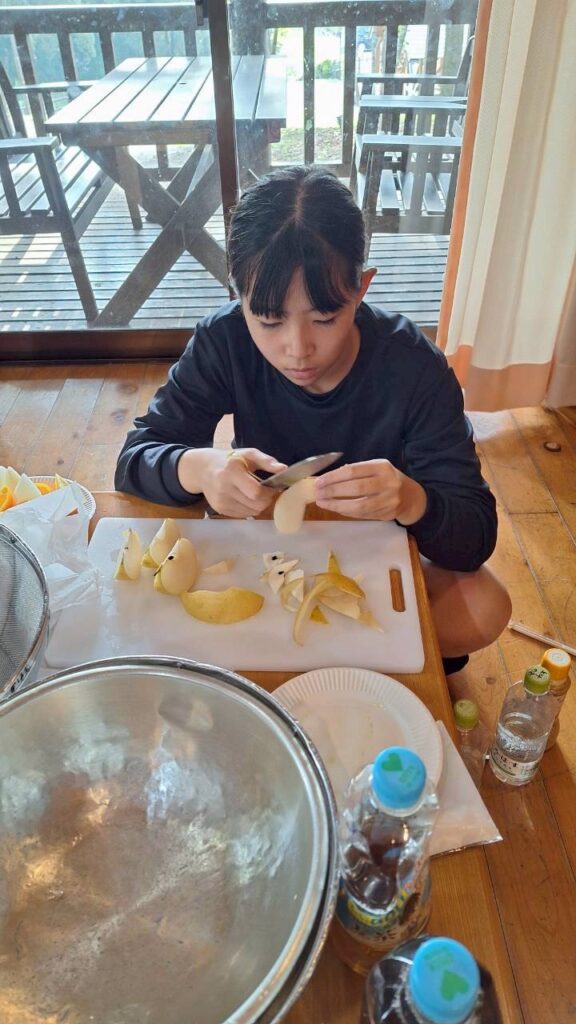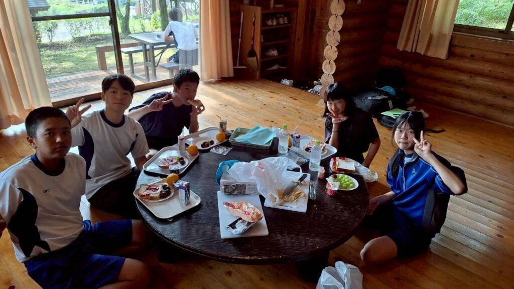 2日目爽やかな朝を迎え、朝食づくりが始まりました。それぞれのログハウスで班ごとにサンドイッチや果物を準備し、みんなで協力して朝のひとときを楽しみました。出来上がった朝食はとてもおいしく、笑顔いっぱいでいただくことができました。