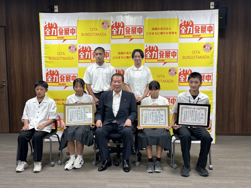 第63回大分県中学校総合体育大会の結果報告および九州大会への決意表明のため、柔道部の山口舞子さん(9年生)と佐藤光さん(7年生)が市長を訪問しました。九州大会での活躍を期待しています。